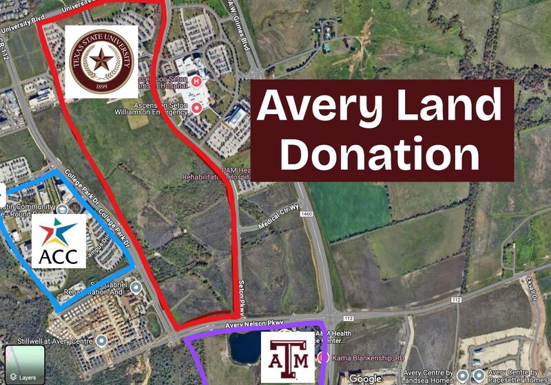 Below is a map that shows the parcel of land donated by the Avery family in 2004. The land stretches from Avery Nelson Parkway north to University Boulevard, between Seton parkway and College Park Drive. It also includes two nearby parcels of land donated to ACC and Texas A&M, including land donated to construct hospitals and medical centers.